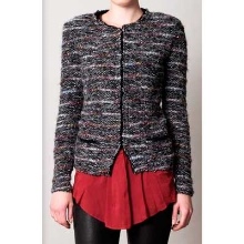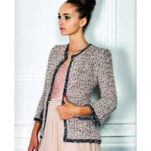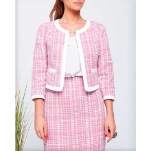 A classic Chanel jacket made from soft tweed. The length is short - it barely reaches the top line of the skirt belt.The pattern is always very elegant - in an intricate cage or with a melange effect. The silhouette of such a jacket is necessarily semi-adjacent, there is no collar, the fastener is on buttons or missing. Coco herself was very fond of the last option: a delightful trendsetter stabbed such a jacket with a brooch or cameo.