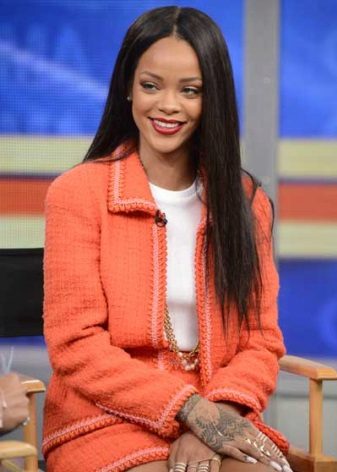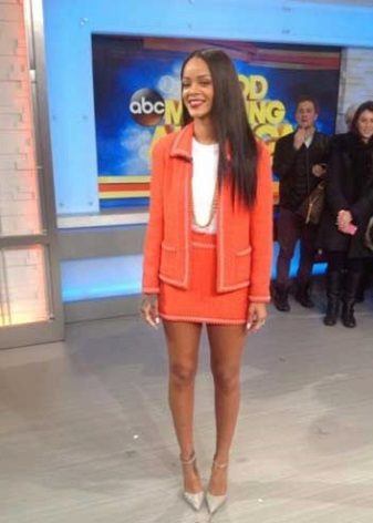 Popular singer Rihanna is also not averse to emphasizing her femininity with the help of a delightful style dictated by Chanel costumes. Particularly spectacular, the star of the world radio broadcast looks in an ensemble of warm coral color that goes well with her skin tone and appearance.