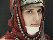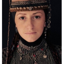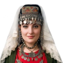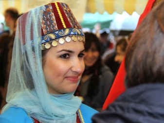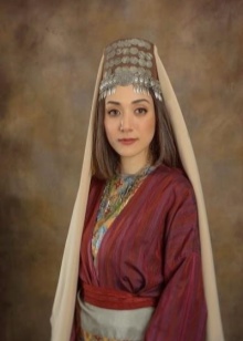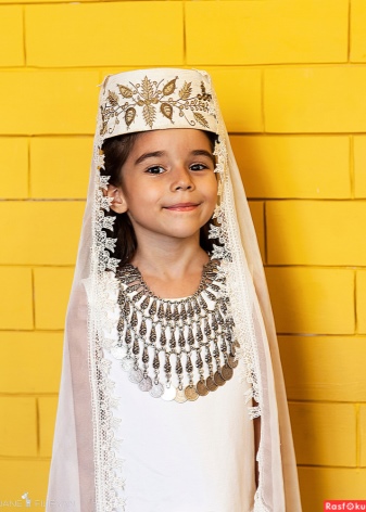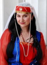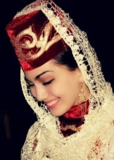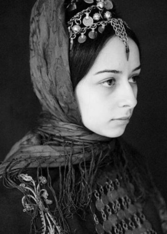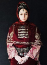 Under the backside, a ribbon with fixed coins made of precious metals was tied to his forehead, jewelry made of silver balls, corals, which almost completely covered his hair, was fastened at his temples. Such an unusual headdress was tied with diagonally folded snow-white scarves of cotton fabric, covering the neck and part of the face to the nose. Initially, the scarves were snow-white, and later - reddish or greenish. Corners tightly tied at the back of the head. On top of the base was covered with a colored shawl, fastened with a chain of precious metal.