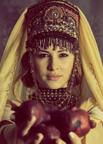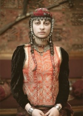 An elegant addition to the headdress were large buttons called “kotosh”. The hostess of such jewelry was crowned with a row of gold coins and a noticeable large coin in the center; intricate pearl jewelry, ending in the finest gold plates, was fastened at the temples. Such an interesting precious adornment, the young bridegroom presented to the young bride on the wedding day. Ward, as a rule, crowned a scarlet hat called "fez" with a silk brush hanging down behind it.