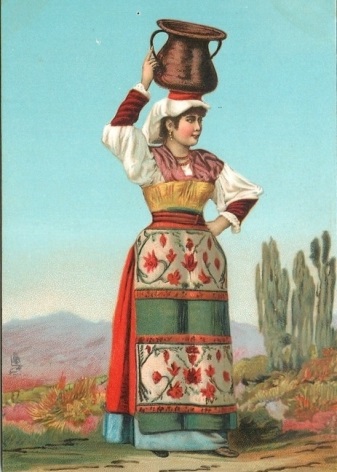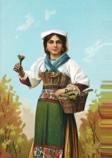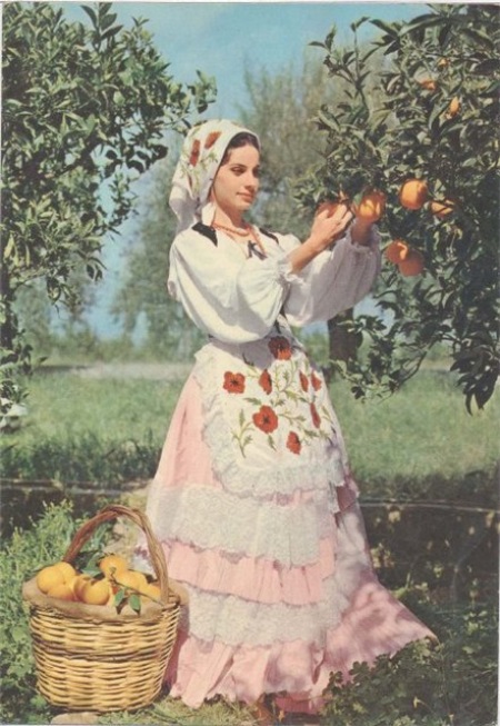 National outfit of a young girl in Sicily. A fluffy pale pink skirt decorated with lace, a white shirt, a corsage, a white apron, with poppies embroidered on it and a scarf that duplicates it on the head. In the photo, the girl collects oranges, but in everyday life, of course, they wore more modest dresses. Such spectacular outfits were intended for a solemn occasion.
