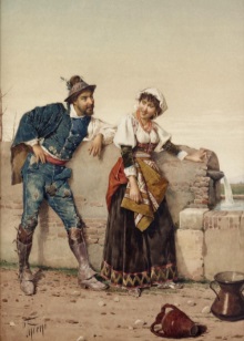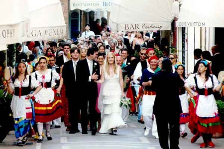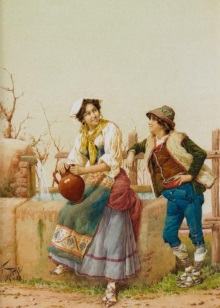 Italian wedding in national costumes. The bride has a rich outfit that is replete with embroidery, gold and jewelry. On the head is a traditional white shawl. The groom's suit is more restrained - he wears a white shirt, underpants and a dark blue brocade vest.