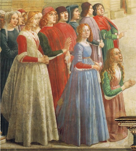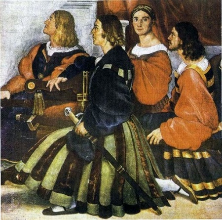 Nobles always carried a sword (left) and a dagger (right). They complemented the suit with a purse on the belt, gloves and a massive golden chain. The women's suit was much more spectacular and richer, the girls wore a dress with a tight-fitting top and a pleated skirt, which was called a gamurra. The image was complemented by a light cloak or piece of fabric, which was attached to the dress.