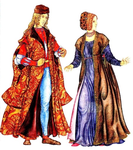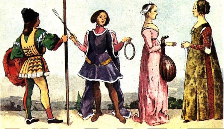 An elongated deep-necked caftan was worn by older men. It was combined with a white breastplate (prototype of the shirt shirt). Over time, the outfit of the Italian changed. Shirts that were pulled together by a cord around the neck came into fashion. They were worn with a deep square neck caftan or stand-up collar. Combined it with stockings and trousers to the knee. From above they put on a jubbone - a magnificent and long cloak, which eventually became narrower and shorter. He had magnificent sleeves and a large collar.