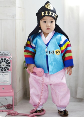 The suit for the boy on his first anniversary is a pink or blue jacket called zhogori and a long blue cloak called kory. The girl is characterized by an outfit consisting of a colored jacket in a strip or a festive tane jacket, which for some time has been popular among the people of Korea.