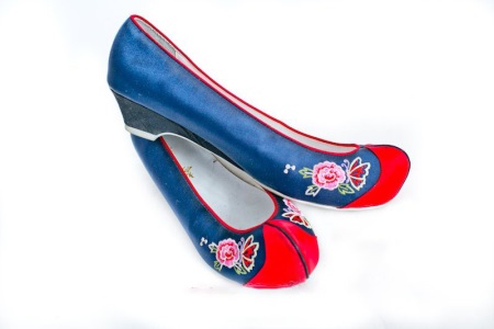 Embroidery on a suit that used to adorn the outfits of only aristocrats occupies a special place and is a characteristic feature of the hanbok. Embroidered floral, animalistic and other ornaments are traditionally located on the hem at the skirt and on the sleeves. A Korean suit for women is complemented by white sleepless socks with straight seams and costin silk shoes.