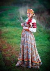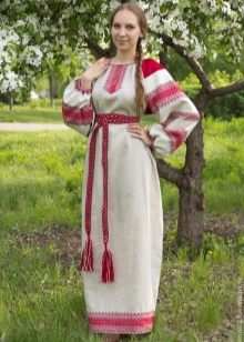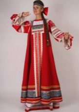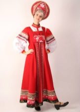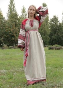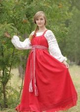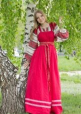 Loose red sundress on the straps, floor length, belted under the chest belt, embroidered with ornaments. Under the sundress, a shirt with long straight sleeves and a print with traditional patterns.