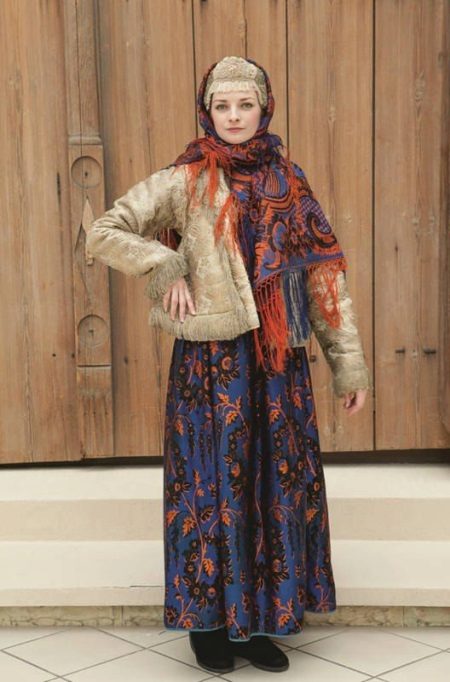 Costume from the "Enchantment of the Russian North" collection.An elegant sundress of saturated blue color with a floral black-and-orange ornament, beige shubeyka and coruna in tone (headdress), and on top a warm shawl. Since the suit is winter, the most suitable shoes are felt boots.