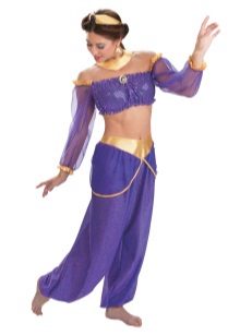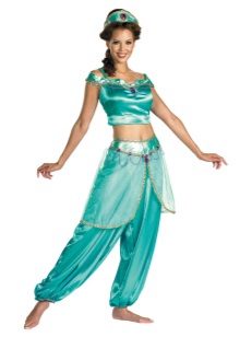 On dark-haired dark-skinned girls will look great costume of the beautiful Mulan. Will do and outfit beautiful jasmine in oriental style. Blue harem pants and a top of the same shade will look great with shoes and accessories of a golden color, as well as jewelry in the form of large gemstones.