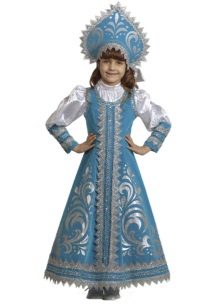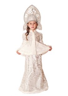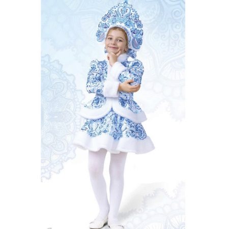 - The most wonderful image of a snow maiden is perhaps the most popular option for the new year. The suit, consisting of a skirt and a jacket, is decorated with a blue pattern on a white background, and the painted kokoshnik will be an excellent headdress.
