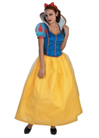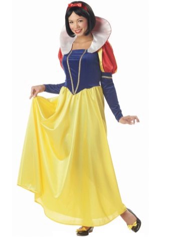 Speaking of Disney princesses, one cannot help but recall Snow White, whose robe is a magnificent dress on the floor, the top of which is made in blue, and the bottom is a beautiful lemon color. The sleeves of the flashlights betray the volume to the shoulders, and the red ribbon in the hair is the final detail of the outfit.