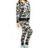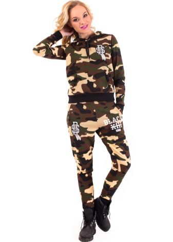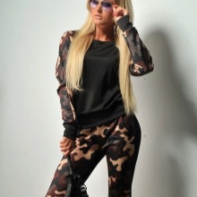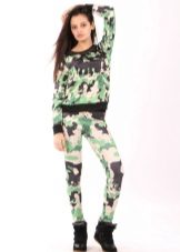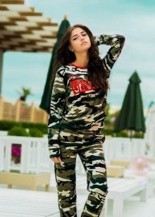 This kit is similar in style to the previous one. However, a charming neckline of the “boat” neckline with a bar of a purely female green color brings a flirty touch here. The same green stripes adorn the long sleeves of the sweatshirt. The camouflage color of this costume is very bright and contrasting.The image is adorned with the girl's long dark hair, loose on the shoulders and her exquisite makeup with an emphasis on the eyes. Massive white sneakers are quite out of place here.