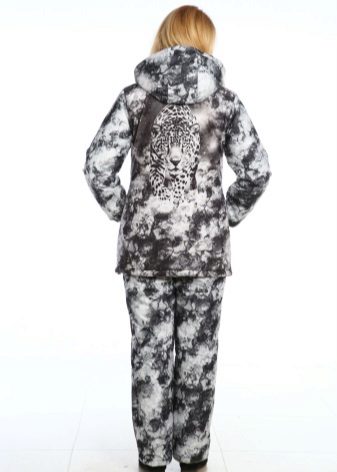 A double synthetic winterizer layer and heat-resistant fleece, pleasant to the body, act as a suit insulation. Fleece is also modern, capable of taking moisture out. A fashionable detail of the costume is the image of a leopard on the back, which looks harmonious against the background of a camouflage print.