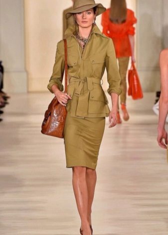 Modern women's suits in military style can have both traditional khaki and darker or lighter colors. Summer cotton-based options are often made in gray, blue, beige. You can also find a dark red model.