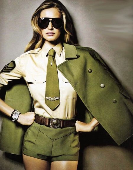 The military style, although it is associated, first of all, with severe men, looks also very interesting on young fashionistas. Choosing such an outfit, the main thing is not to look too courageous. To do this, you can initially choose a kit with a delicate floral print, which will make the image easier.