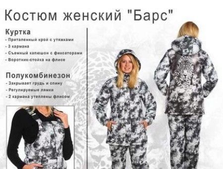Very practical winter versions of suits in a military style. After all, men, stocking up for themselves equipment, must remember about their wives. Especially for the fair sex, the designers developed the Bars winter suit, ideal for a walk or a picnic in the cold season. It takes into account the peculiarities of the female figure: it emphasizes the waist, does not hang in certain places, has a tightening below. These stylish clothes allow a woman to remain a woman in any situation.
