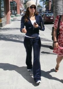 If a velor suit is part of a sports wardrobe, then a T-shirt, top, T-shirt and sports shoes (sneakers or sneakers) can be used as an addition. The cap will complement a bright sporty look.