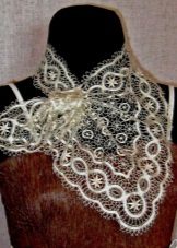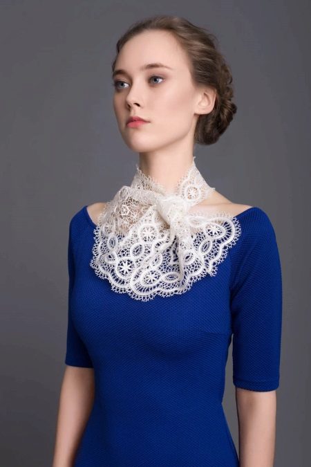 A very delicate look in retro style. The white French scarf is decorated in the shape of a fan.Made of exquisite lace, it gives the girl a sophisticated look and blends harmoniously in color and texture with a blue dress that reveals a chiseled neck. Note that the romantic hairstyle of the girl is consistent with the chosen style of clothing.