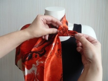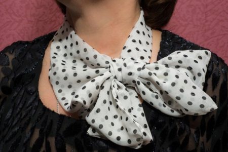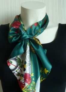 Romantic people can design a stylish French scarf in the form of a voluminous bow. To do this, the free side must not be tightened to the end, but only to the middle. A small bow is obtained if you connect the opposite corners of the franton, pass them into a loop and spread them in opposite directions.