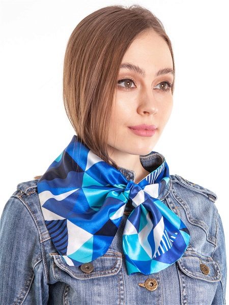 The French scarf is a universal thing suitable for any outerwear. In this case, she looks great with a youth denim jacket, making the outfit more feminine. Abstract blue and white ornament on a white background blends perfectly with light denim. A miniature silk accessory is in harmony with the color of the hair and eyes of the girl.