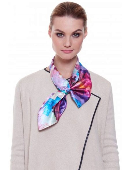 Franton's original color scheme (multi-colored geometric print) allows you to combine it with many outfits. In this case, the accessory harmoniously looks with a white cardigan of asymmetric cut. A shawl of shining silk refreshes the image, makes it more interesting.