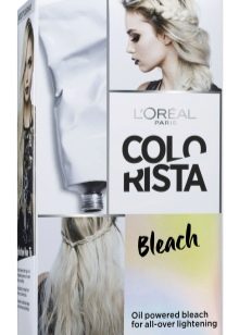 - Soft bleach - brightening ammonia-free cream paint, which allows you to get lighter shades on the blond or discolor the hair for subsequent color dyeing using the palette of rainbow shades. It bleaches up to 8 levels and is equipped with a caring conditioner that neutralizes yellow pigment. L'Oreal advises using this product before applying Colorista products (one-day spray or jelly spray or a two-week tint balm).