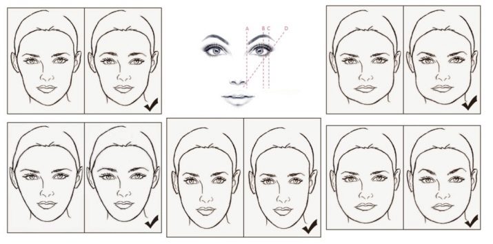 Chubby girls are well suited for the eyebrows with a smooth break and a slight bend. Owners of a square or rectangular face will fit straight eyebrows without kinks and bends.