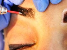 - Before starting the procedure, the master assesses the general condition of the eyebrows, the individual characteristics of the face and facial expressions. Then degreases the skin with a special alcohol-based lotion.