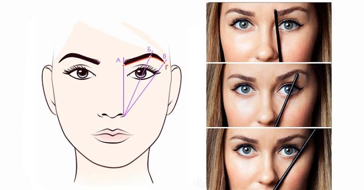 Using a pencil, as shown in the picture, you need to identify 3 points: the beginning, the highest arc, the end of the eyebrow. To do this, a pencil is applied to the edge of the nose, gradually moving towards the end of the eyebrow.
