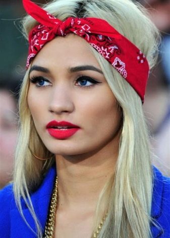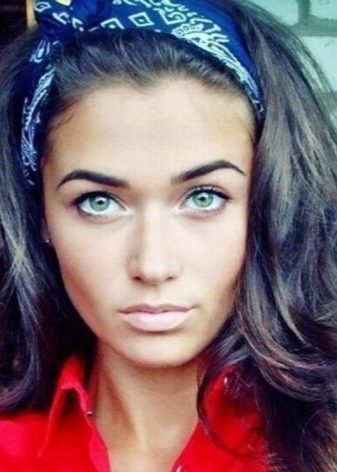 You can wear a scarf on your head, for example, twisting it into a turban. This design will give volume and extend the crown. The “companion” for the turban should be loose hair, you can curl them slightly.You can tie a scarf by the type of hair hoop, but only after loosening the hair and making a light pile on the top.