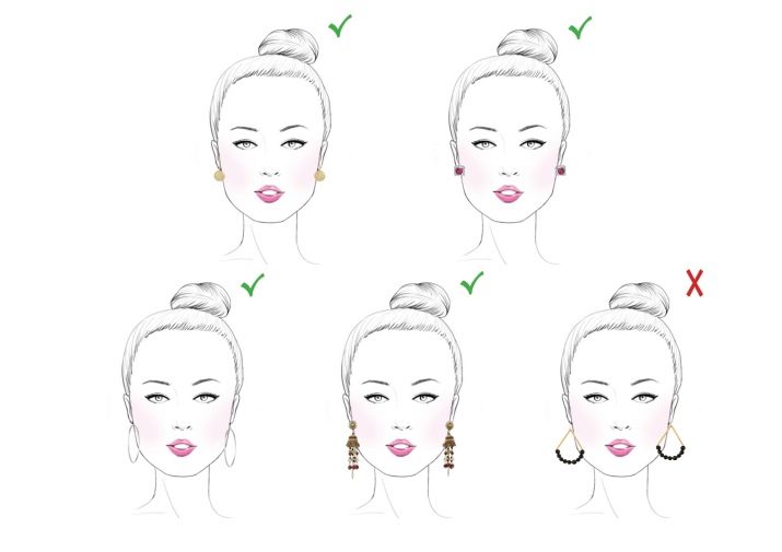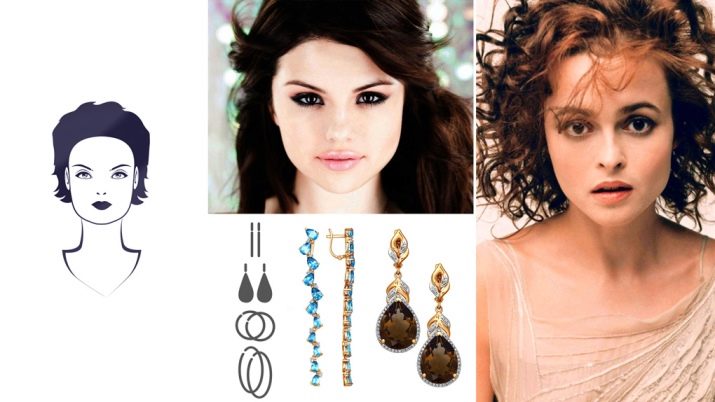 The choice of jewelry, in particular, earrings for girls with this type of face is quite diverse. The main rule is to avoid flat jewelry, earrings with sharp corners, rough shapes. Ring earrings, even of large diameter (they will make the face shape softer), hanging iridescent earrings, jewelry of flowing forms of an unusual configuration, will be suitable.