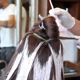 - Next, you need to prepare the compositions for painting. To put on gloves, to distribute the coloring pigment on hair with the help of a brush or a small sponge. During highlighting, the hair must be treated evenly along the entire length, while balayazh involves wide horizontal strokes. Ombre is done in a vertical way by applying coloring pigment. Foil is not required in all stains.