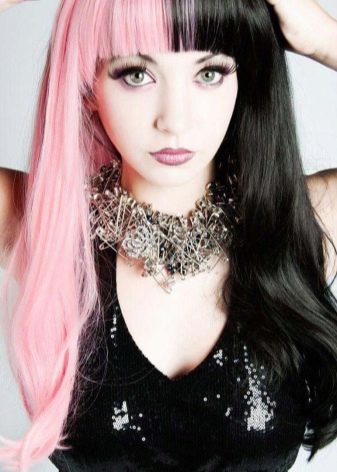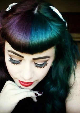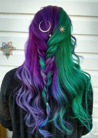 The method used in this type of painting involves dividing all hair into two equal parts. Further, the curls are painted in different colors, and the border between the selected color scheme can pass not only vertically along the parting, but also horizontally along the length.