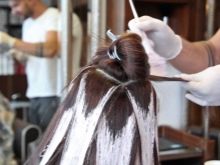 - Dyeing on dark hair should begin with lightening of individual strands or the entire layer of hair, depending on the type selected. For this, a clarifier is prepared in a container, and then applied to selected curls. In this case, it is necessary to carefully separate and protect the upper and lower layer from the middle, if it is painted with foil. This is necessary so that the clarifier does not fall on unpainted areas.