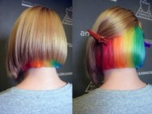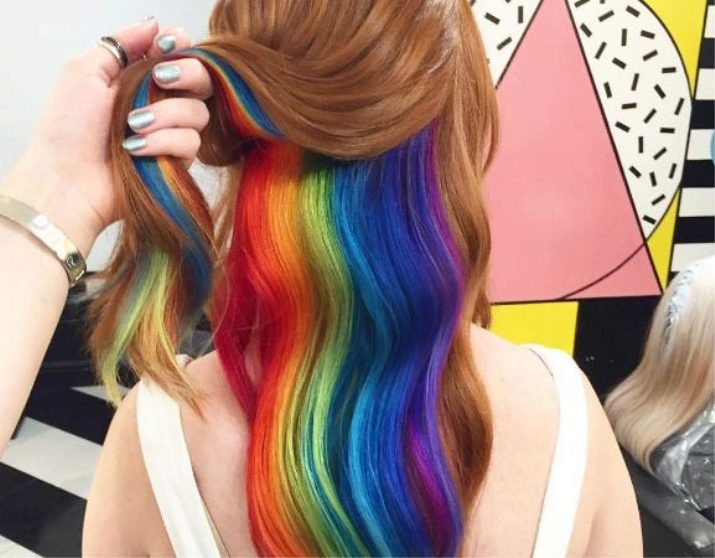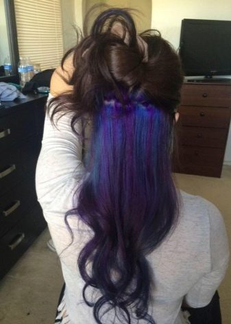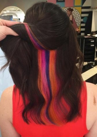 Hidden coloring came to us from foggy Albion and managed to win a lot of fans already. The essence of this technique is to dye the lower or middle layer of hair, which is closed under the main strands. This technique is especially popular with the younger generation, as well as with girls who want dramatic changes in appearance, but for one reason or another it is not permissible, for example, a strict dress code at work. The peculiarity of this staining is the color scheme, which is radically different from the natural curl.