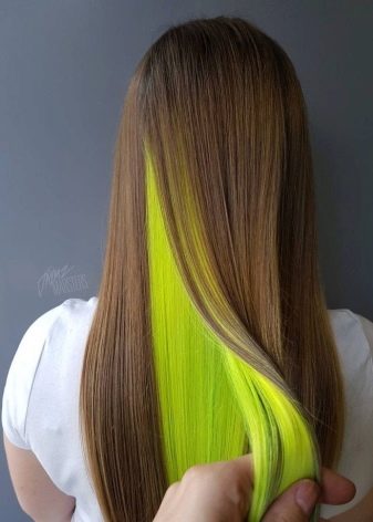 Before staining dark curls, they must first be lightened, otherwise the desired bright shade will not work. Another feature is the length of the hair. It should be such that, if necessary, it was possible to hide colored curls, so this coloring is not suitable for all haircuts.