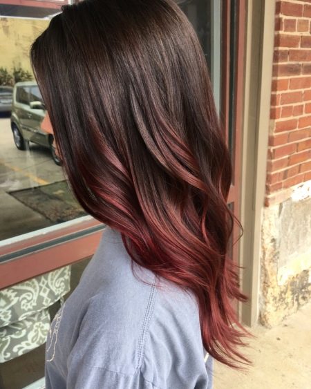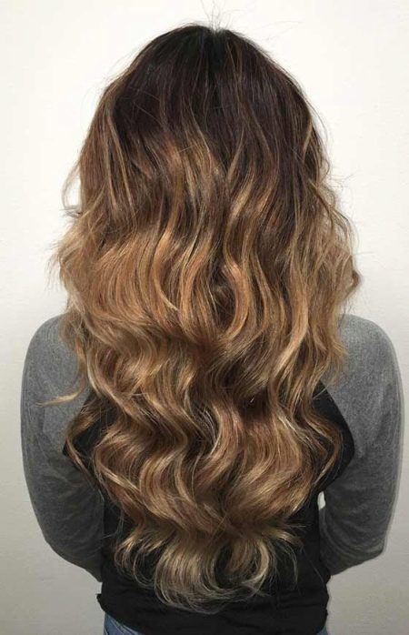 Next, pay attention to the length of the hair. If they are long, then the color or ombre with colored strands in the lower area will look amazing on them. The transition from natural dark to cool blue or purple will make the image creative. But it is best suited to those ladies who prefer curls or wavy hair. If you have straight hair of medium length, then natural transitions to copper or caramel will look good. The ensemble can also include strands of golden color to create a beautiful transition between shades.