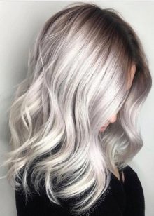 Partial dyeing is a great way to get pearl-white curls without damaging the hair roots. In this photo, the color transition looks contrasted, but not too sharp. Most effectively, such hairstyles look exactly with a curl. For a solemn occasion, you can wind the curls with a curling iron, and in everyday life wear straight hair, because the black roots still remain in trend.