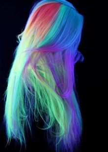 Using a relatively new technology of neon dyeing will help to make a dark hairstyle truly bright. It does not last long, it will come off after seven washes, but the effective result is worth the money spent. The process of creating such a masterpiece of hairdressing is quite understandable. First, the desired strands are clarified with an oxidizing agent, and then a special gel is applied to them, which allows you to get not just colored, but literally light-emitting curls.