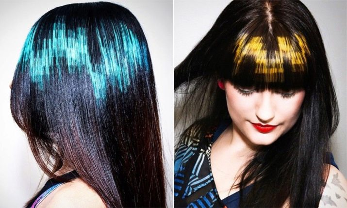 - Here is an interesting combination gives pixel coloring. Looks on straight long hair very effectively, and you can choose any shade. In these cases, on dark hair, blue and original yellow look very beautiful. Moreover, this type of staining has no restrictions. You can choose the most daring solutions, or you can create a more relaxed everyday option, as in this case. It looks very interesting, stylish, but suitable for any situation.