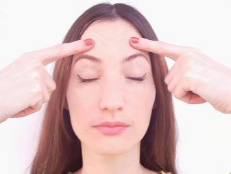 Then proceed to massage the upper still eyelid. Grab your eyebrows in such a way that your thumb is on a fixed eyelid and the index finger on your forehead. Lightly pressing movements go from the bridge of the nose to the temples. Repeat the movement 3-4 times. Work the same area with vibrating movements - move from the temples to the bridge of the nose along the eyebrow line in zigzags up and down. This will relax the muscles of the forehead and activates the outflow of lymph.