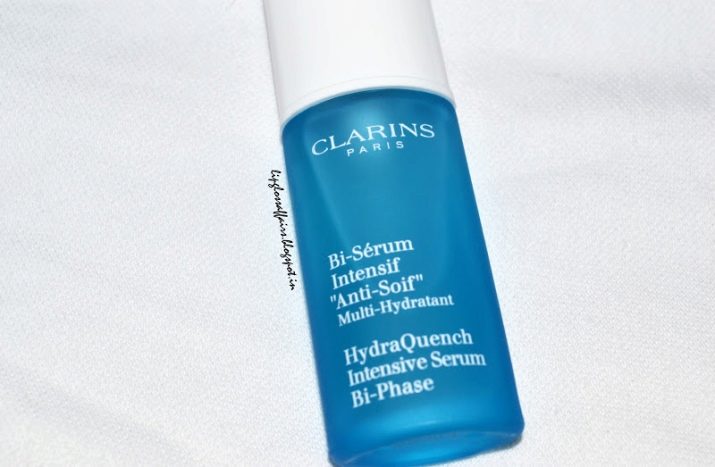 - Clarins Hydra Quench Intensive Serum. Two-phase serum has hyaluronic acid in its composition and plant components. Thanks to this composition, the cosmetic product saturates the dermis with moisture and makes it smooth. Also in the composition is vitamin E, which acts as an antioxidant.