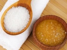 - Saline. Such compositions quite effectively soften rough skin at home. For the procedure, 1/2 tablespoon of salt is mixed with 1 liter. honey and rub into the skin for 5-10 minutes. If the skin is too dry, you can add a little sour cream or oil to the composition. First you need to make sure there is no allergy to honey.