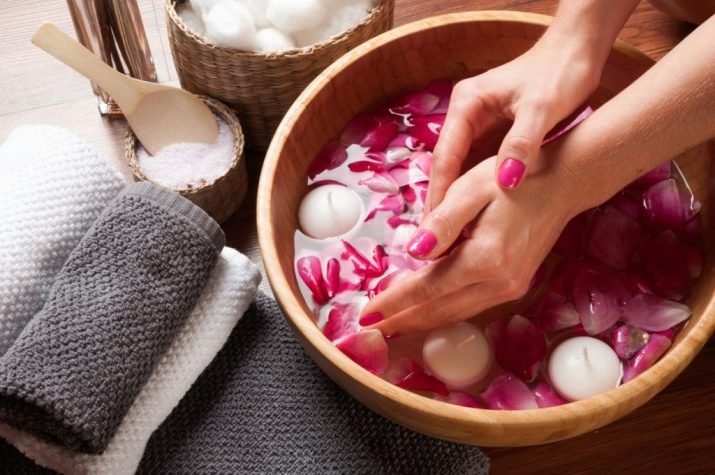 It is possible to use ordinary coarse salt, which is in every kitchen. For this recipe you will need a glass of hot water and thirty grams of salt. Here you can add a few more drops of pink or some other cosmetic oil, and you can add exactly ten drops of iodine. After the procedure, hands should be thoroughly washed and moistened.