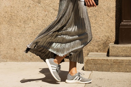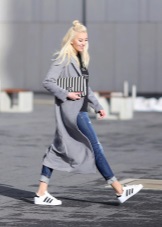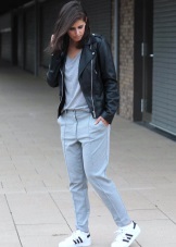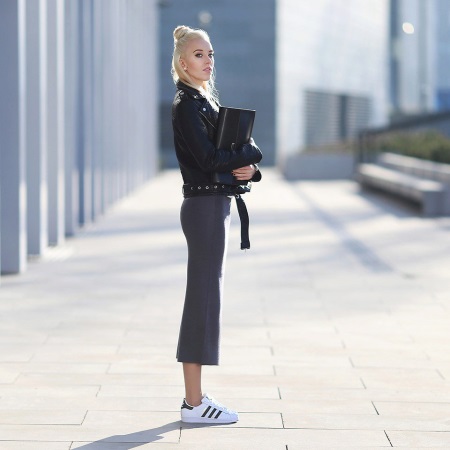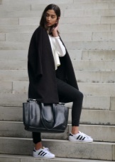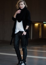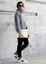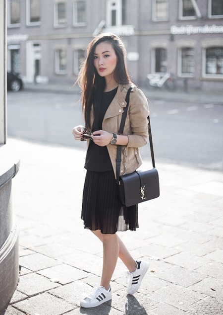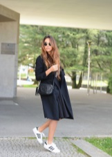 Adidas sneakers look original with a pencil skirt, a blouse and a black jacket. This is a rather unusual image, but it makes it even more attractive. In this case, the sneakers should be of restrained colors, and their sole should not be too embossed.