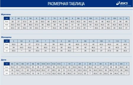 The size range of Asics sneakers does not coincide with the Russian one, but is focused on American and European sizes. Therefore, it is very important not to make a mistake when choosing your size. There are special tables and dimensional grids for this.