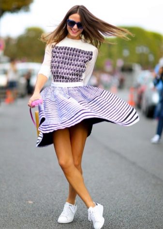 So, white sneakers from Adidas are appropriate to wear with flared and pleated skirts a la Barbie style.