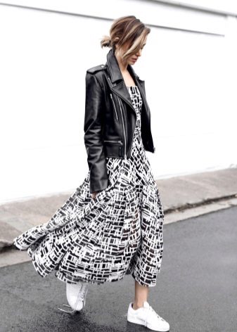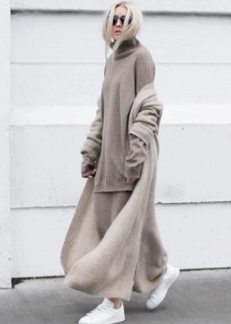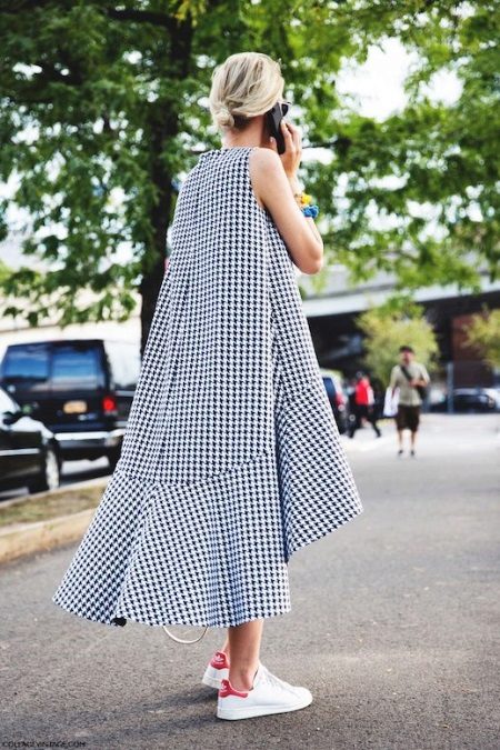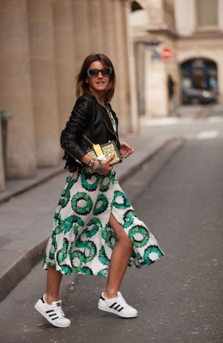 White sneakers worn with a large-knit dress are a great solution to evening out in the fresh air. A miniature handbag with a long belt will make the image more sensual.