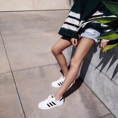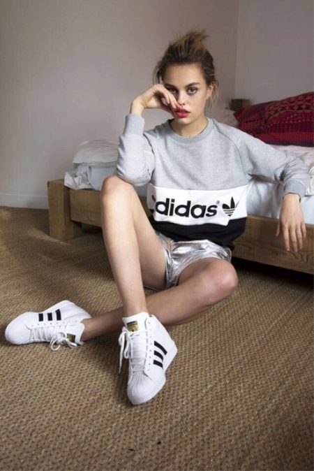 An oversized sweatshirt and shorts work great with Adidas sneakers.