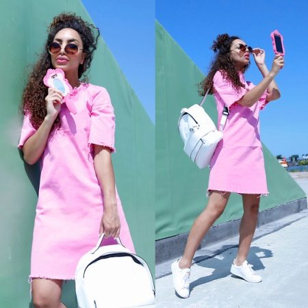 A dress of a spacious cut of feminine pink color, hiding the flaws of the figure, together with such shoes looks extremely romantic.